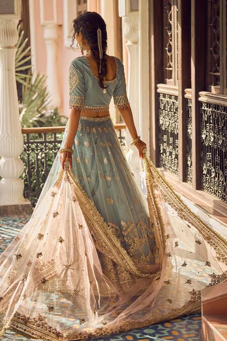 Blue Net Sequins, Stones, Zari V-neck Floral Embroidered Bridal Lehenga Set