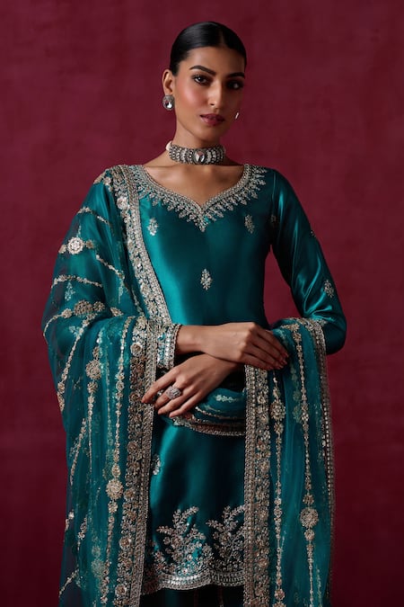 Sea green kurta featuring floral embroidery with zari and sequins. Paired with a dhoti pant and dupatta adorned with all-over floral sequin embroidery.