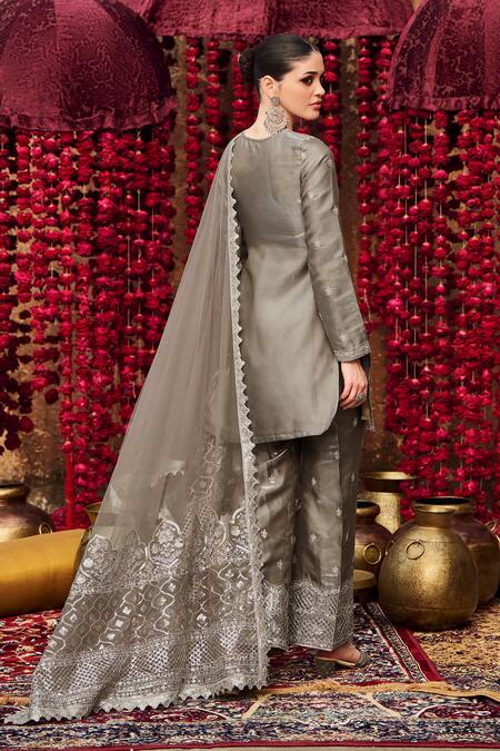 Grey kurta featuring zari, sequin & thread embroidery in floral pattern. Paired with a scallop dupatta and pant.