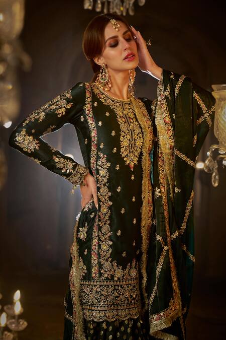 Bottle green kurta featuring zari thread embroidered floral jaali motifs with sequins. Paired with floral butti pattern tulip pant and kiran border dupatta.