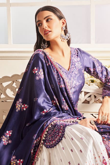 Blue kurta featuring all-over floral Mughal print with a scalloped border and pearl embellishments. Paired with a printed gharara and scalloped lace-lined dupatta.
