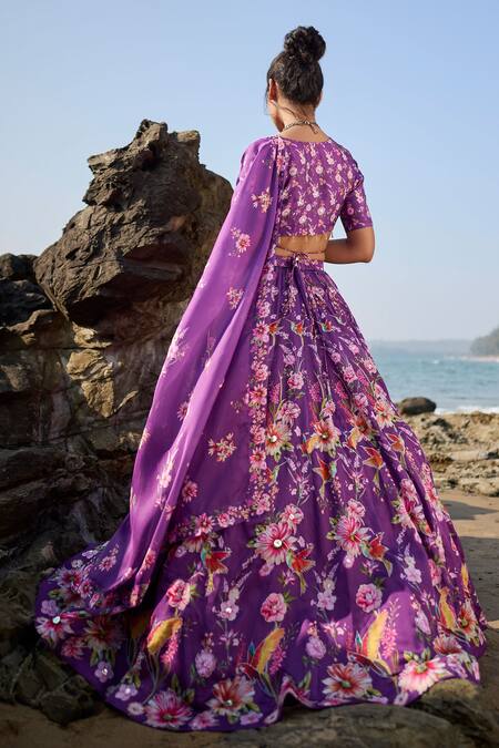 Purple lehenga featuring a floral print, complemented by a plunging V neckline blouse and matching dupatta. The set includes an A-line flare lehenga with attached can-can and a floral print dupatta.