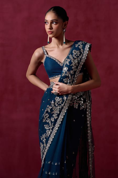 Teal blue pre-draped saree featuring zari and sequin embroidery in floral veil pattern with scallop hem. Paired with an embroidered sleeveless blouse with a plunge back design.