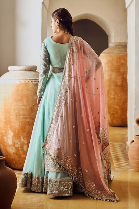 Mint attached cancan lehenga with zari, sequins embroidered border, Contrast dupatta with all over zari embroidered buttis, Please note that this garment runs larger than standard sizing. We recommend reviewing the size guide carefully before making a purchase.