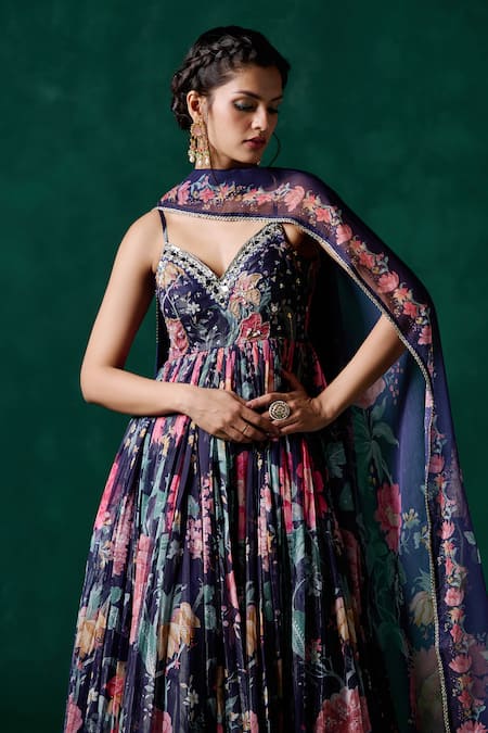 Navy blue flared anarkali featuring floral print with zari, sequins, and mirror work embroidery. Paired with a lace embroidered dupatta.