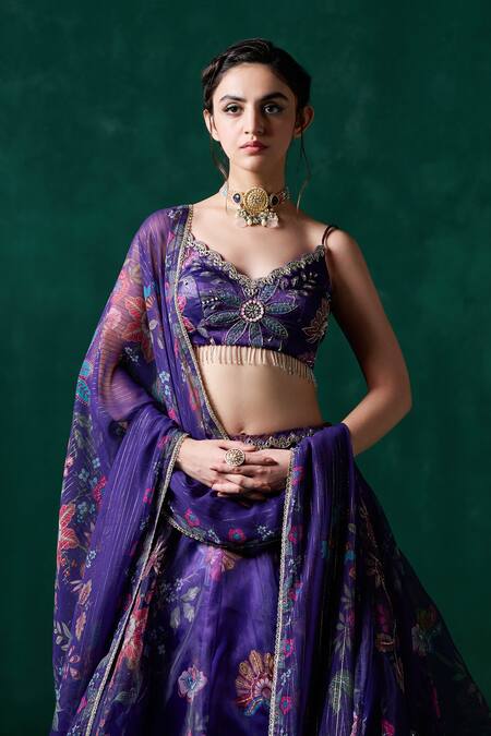 Purple kalidar lehenga featuring floral print with zari, sequins, stone, mirror, and lace embroidery. Accompanied by a padded blouse and lace embroidered dupatta with tassels.