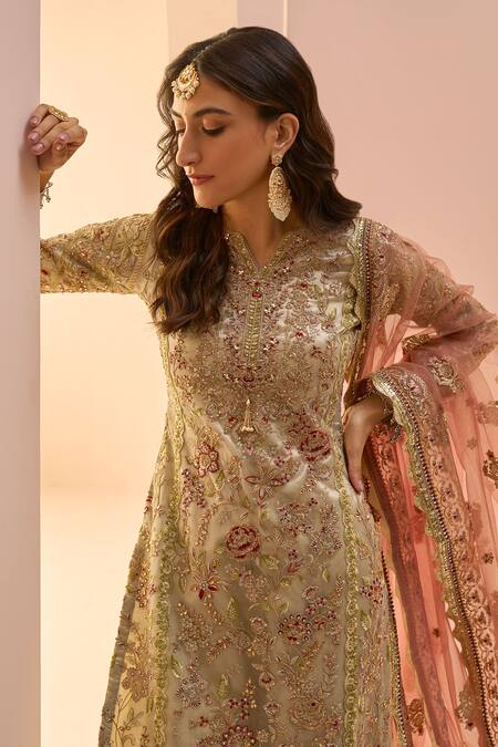 Dusty mint kurta featuring floral sequin, stone, zari, and thread embroidery. Paired with a border embroidered palazzo and scallop bordered sheer dupatta.