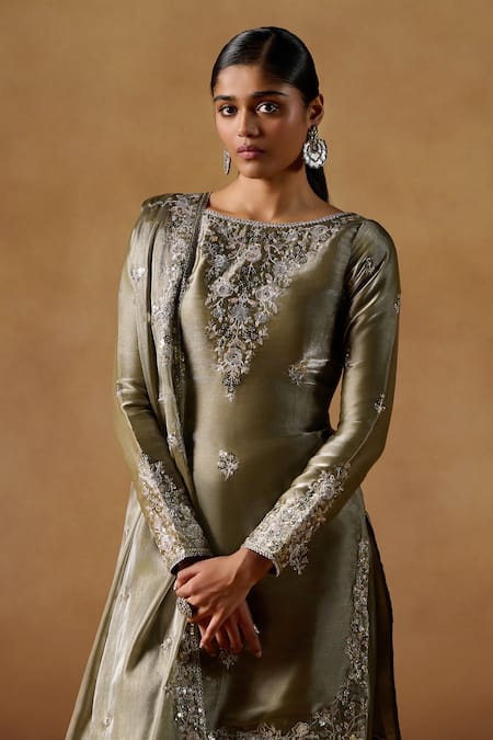 Olive green short kurta featuring zari and sequin embroidery in floral motifs. Paired with an embroidered hem pant and a crystal drop border dupatta.
