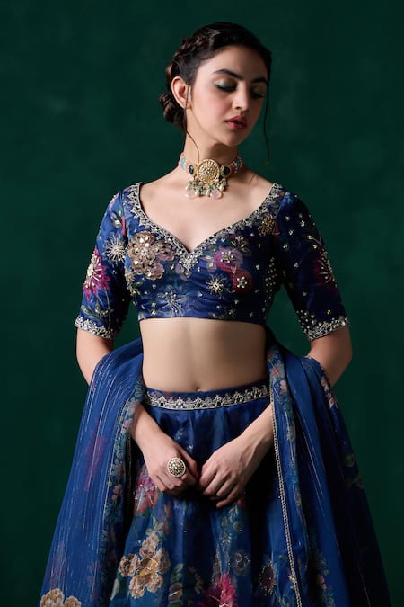 Dark blue lehenga set featuring floral print with zari, sequins, mirror, and stones embroidery. Includes a padded blouse and lace embroidered dupatta with tasselled back detailing.