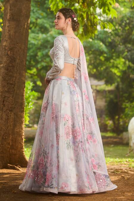 Grey lehenga featuring floral embroidery in pastel shades. Paired with a matching blouse and dupatta made from net and organza with satin lining.