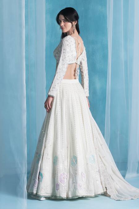 Intricate embroidery on lehenga and blouse, Flowy dupatta with delicate lace edges, Backless blouse design for a modern touch, Please note that this garment runs larger than standard sizing. We recommend reviewing the size guide carefully before making a purchase.