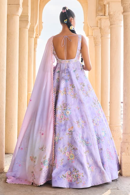 Lavender Anarkali featuring a plunge V neck and embellished butterfly prints. Paired with a sheer dupatta and fitted pant.
