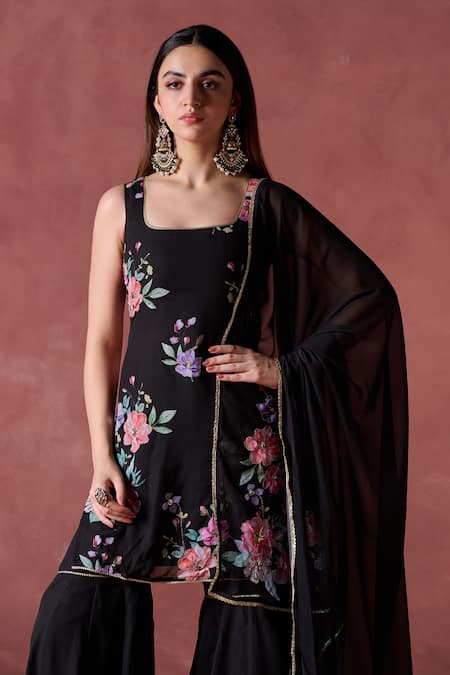 Black kurti featuring a square neckline with an all-over Midnight Garden print and zari-sequin embellishments. Paired with a matching printed gharara and a dupatta.