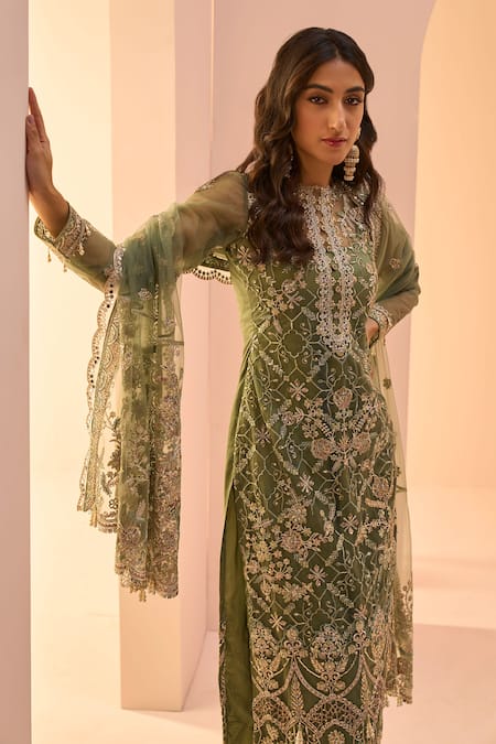 Dusty green kurta featuring intricate sequin, stone, zari, and thread embroidery in a Mughal pattern. Paired with matching palazzo and a scallop bordered sheer dupatta.