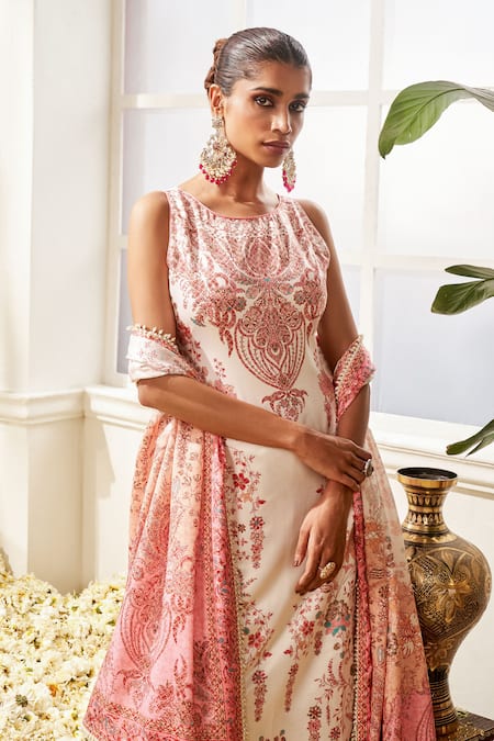 Cream kurta featuring an all-over Mughal floral print and pearl embellished borders. Paired with a printed pleated sharara and matching dupatta.
