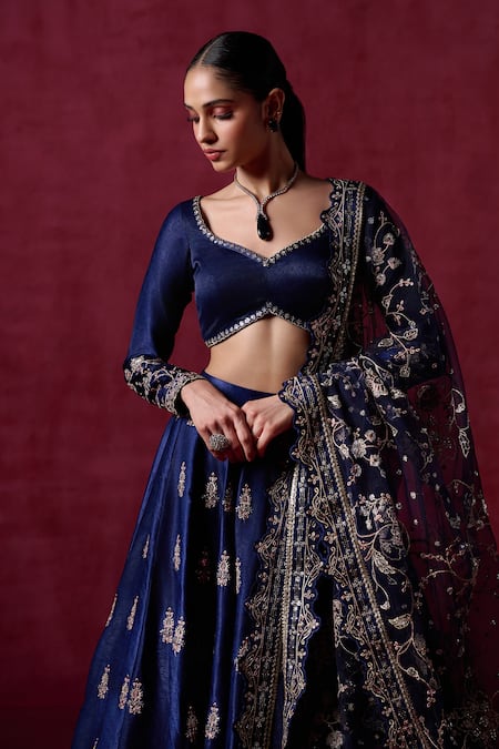 Navy blue lehenga featuring all-over floral butti embroidery with sequins and zari. Paired with a coordinating blouse and dupatta showcasing floral jaal embroidery.