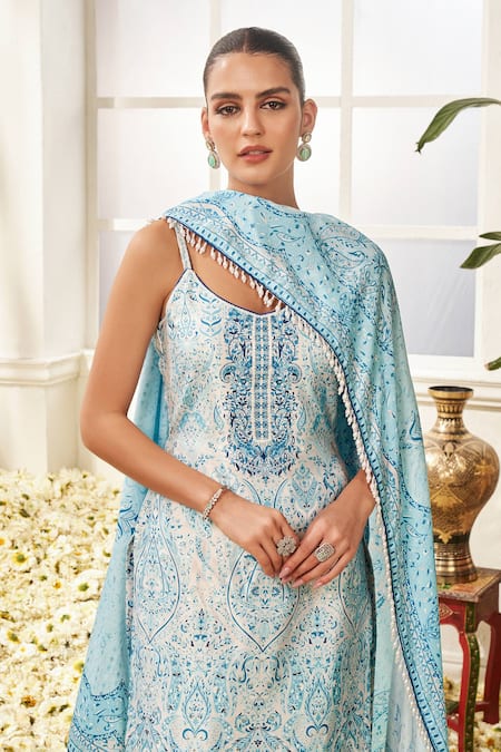 White kurta featuring an all-over floral paisley print with pearl embellishments. Paired with matching pants and a contrast blue dupatta.