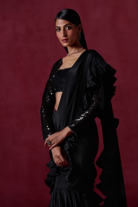 Black pre-draped saree featuring ruffle detailing and a plunge back. Paired with a full sleeve blouse adorned with zari and sequin embroidery.