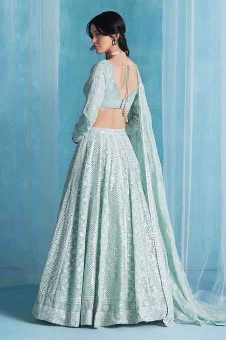 Soft green lehenga featuring intricate embroidery and a flared silhouette. Paired with a matching blouse and dupatta for a complete look.