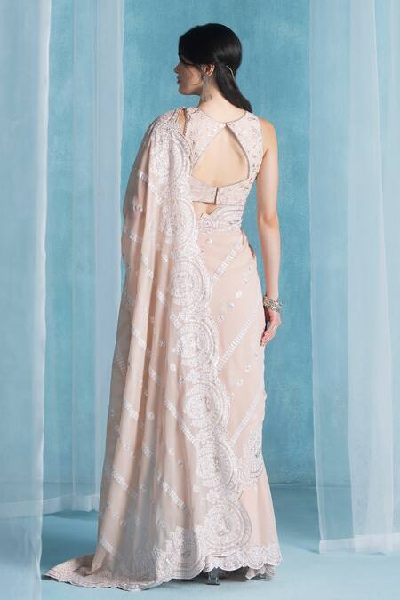 Soft peach saree crafted in georgette with intricate embellishments. Paired with a matching blouse made from santoon fabric.