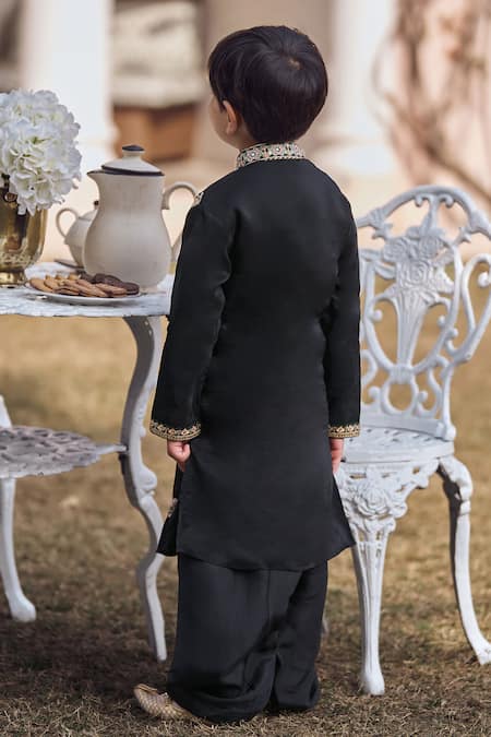 Black kurta featuring full sleeves, mandarin collar, and intricate floral embroidery with zari, sequin, stone, and thread work. Paired with matching pants for a complete look.