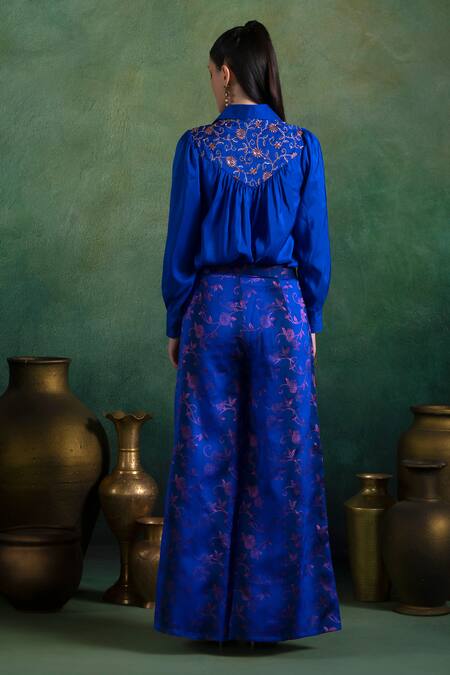 Royal blue shirt featuring balloon sleeves with thread, zari, and sequin embroidery on the collar yoke and back. Paired with bloom woven flared brocade pant.