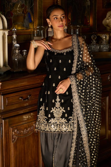 Black velvet kurta featuring intricate thread, zari, sequin, and stone embroidery. Paired with a satin dhoti pant and a net dupatta.