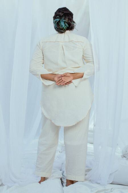 Off-white shirt in hand-woven cotton base detailed with embroidered cutwork running full length from shoulder till hemline.