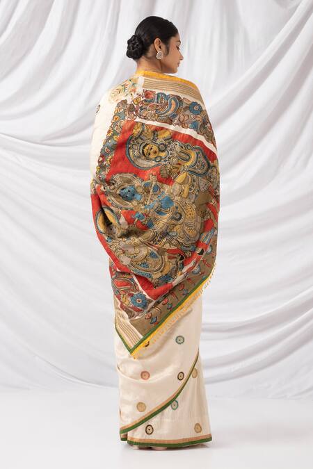 White Silk Applique, Embroidery, Zari Scoop Kalamkari Print And Woven Saree Set