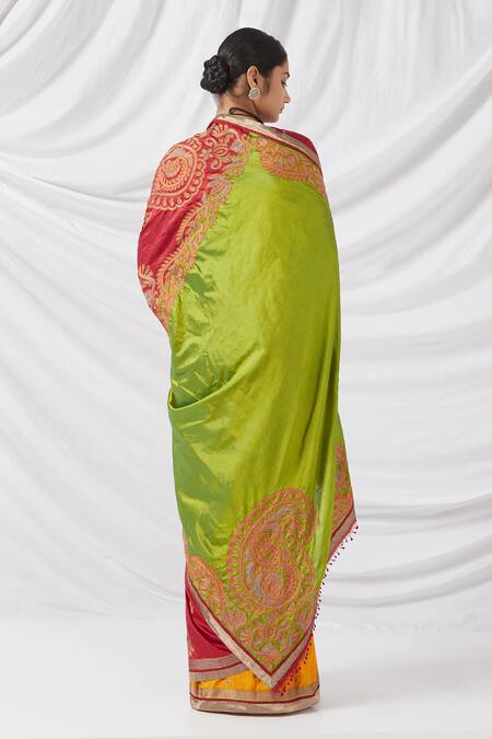 Multi color saree featuring all-over paisley blossom silk thread embroidery. Paired with a half sleeves blouse showcasing bloom motif embroidery.