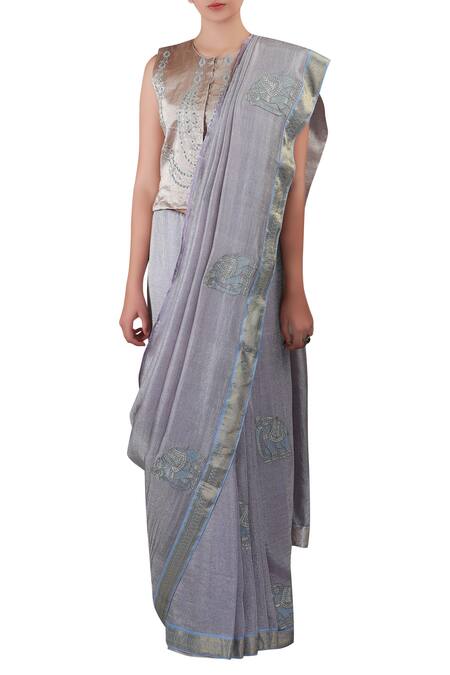 Grey Net, Tissue Round Embroidered Saree With Blouse