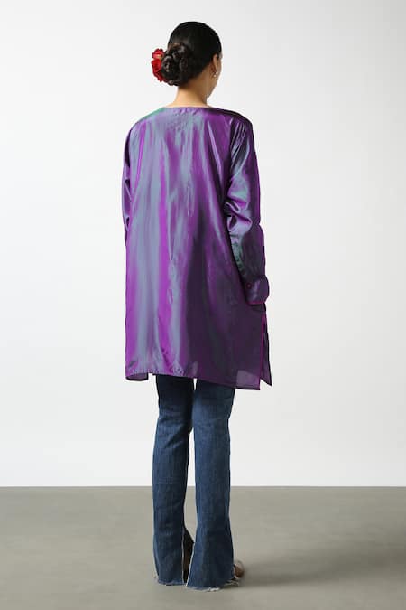 Purple Two Tone Silk Hand Embroidered Thread And Bead Work Yoke Phiran Tunic