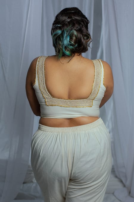 Triangular cutwork lace trims, Back scoop neck, Note:The pant worn by the model is not for sale