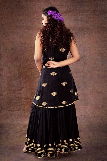 Black kurta in georgette base with Gandaberunda motifs. Paired with flared sharara with polka motifs.