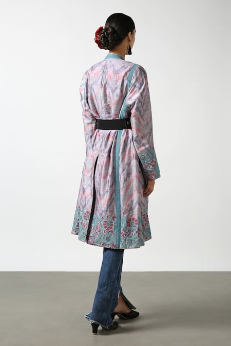 Light purple handwoven silk coat featuring an all-over Ikat pattern and floral contrast thread embroidery