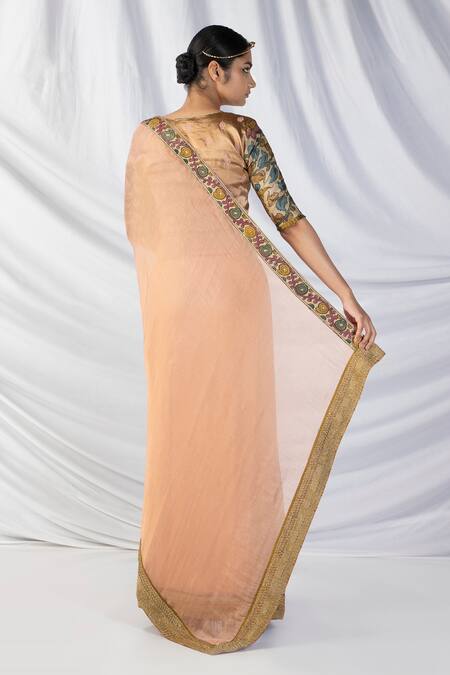 Peach saree in Banarasi soft tissue featuring handpainted kalamkari and dori border embroidered detailing. Paired with a zardozi and silk thread embroidered blouse with bloom motifs.