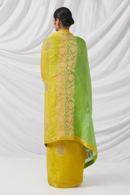 Pineapple yellow saree featuring bloom motif applique and silk thread embroidery. Paired with a butti woven blouse in contrasting green.