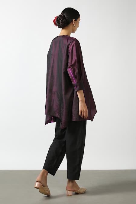 Wine Two Tone Silk Hand Embroidered Thread Work Notched Asymmetric Phiran Tunic