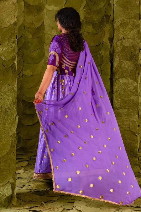 Deep lavender lehenga featuring gota and silk tape embroidery. Paired with a plum violet embroidered blouse and a circular butti embroidered dupatta.