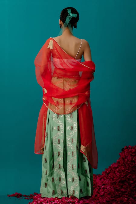 Green Karnataka silk skirt featuring iconic tiger motifs and silver zari hand embroidery. Paired with a pink silk blouse adorned with rose embroidery and an embroidered red dupatta.