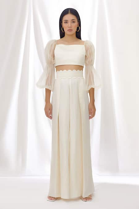 Ivory crop top with gathered balloon sleeves, pleated bodice, square-neckline & elasticated trims. Paired with wide-legged, scallop waistband & pleated pant.