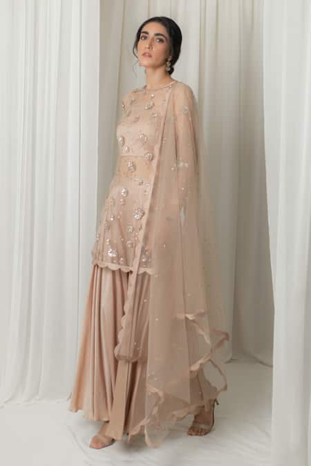 Gold dust tunic with floral embroidered motifs & scallop border. Paired with satin flared pant, fitted bustier & scallop dupatta.