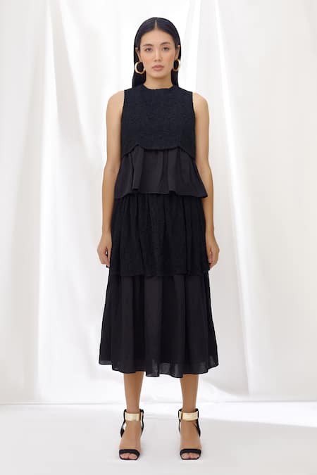 Black peplum top with floral lace embroidered bodice, scallop detail & frill hem. Paired with lace embroidered & layered skirt.