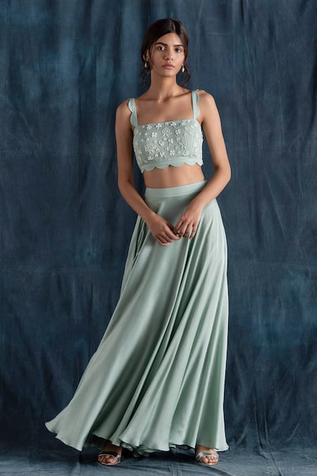 Mint green lehenga with side pockets. Paired with floral embroidered, scallop hem blouse & scallop dupatta.