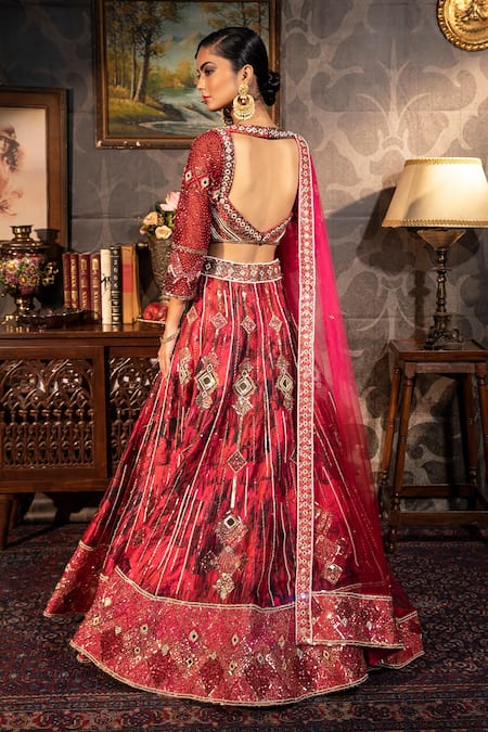 Buy_House of Zyrra by Laxmishriali_Maroon Blouse - Dupion And Net, Dupatta- Net, Lehenga - Geometric Bridal Set_Online_at_Aza_Fashions
