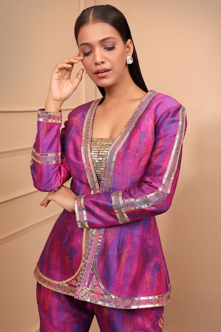 Purple blazer featuring geometric print with gold sequinned embroidery, paired with a metallic embroidered bustier and flared printed pant. The set includes a stylish back cutout detailing and convenient pockets.