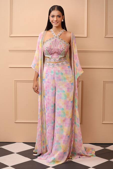 Buy_Laxmishriali_Multi Color Silk, Georgette Beads, Embroidery Geometric Print Cape Pant Set _Online_at_Aza_Fashions