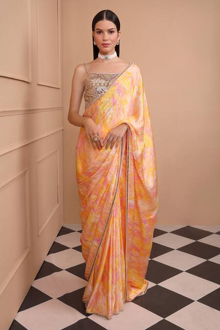 Buy_Laxmishriali_Yellow Denim, , Silk Embroidery Square Neck Printed Saree With Blouse _at_Aza_Fashions