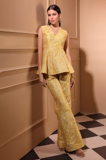 Yellow peplum top featuring a V neck and sleeveless design with geometric patterns. Paired with flared pants showcasing intricate embroidery and pearl embellishments.