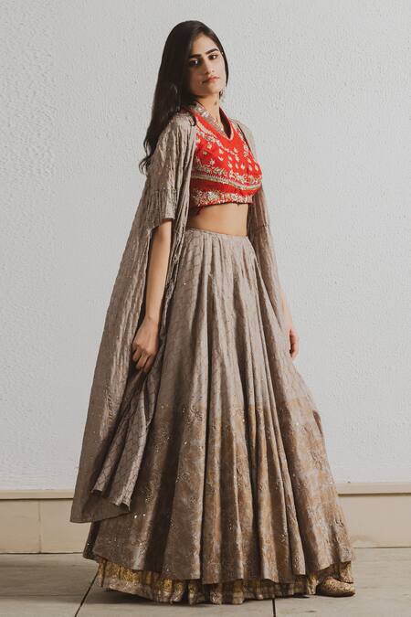 Grey habutai silk cape in lattice block print with layered block print lehenga and blouse.